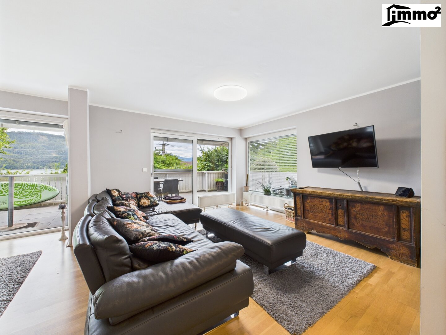 Die Wohnung befindet sich im Erdgeschoss (Hochparterre) und vereint Großzügigkeit mit einer durchdachten Raumaufteilung. Besonders hervorzuheben ist die ca. 39 m² große Terrasse, die sich entlang der Südseite erstreckt und Ihnen einen herrlichen Blick auf den See und die dahinter liegende Bergwelt bietet. Der Wohnbereich ist hell, weitläufig und bietet Zugang zur Terrasse.